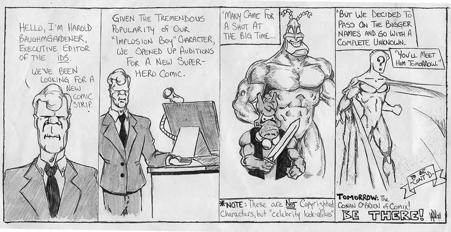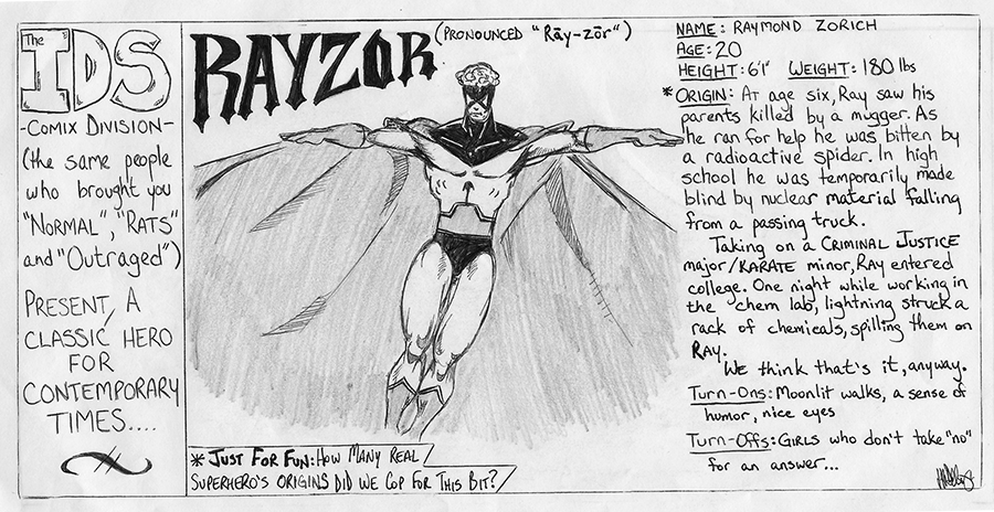 My sophomore year of college, I wrote and drew a daily comic strip for the student newspaper called Rayzor. The strip centered on Raymond Zorich, a college student by day/vigilante by night.